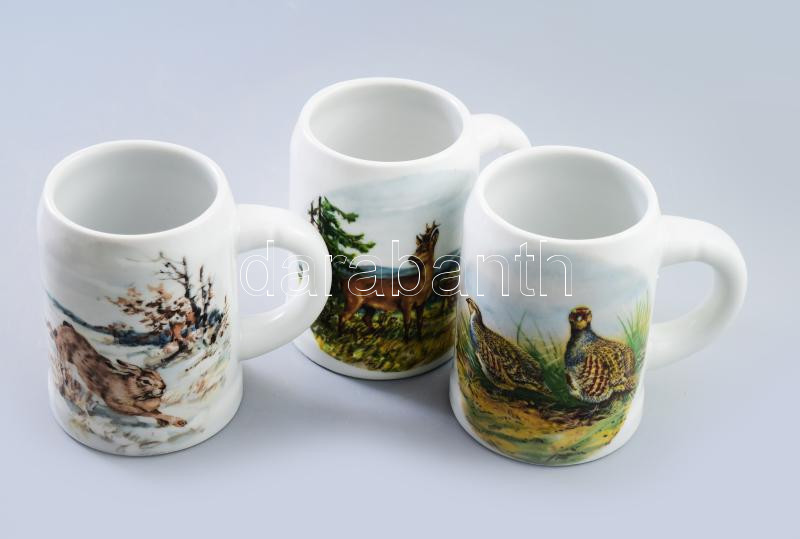 Beschreibung: 3 darab vadászjelenetes porcelán söröskorsó, jelzés nélkül, hibátlan, m: 13 cm