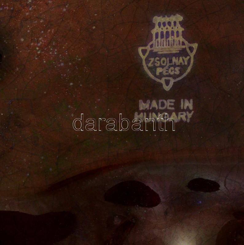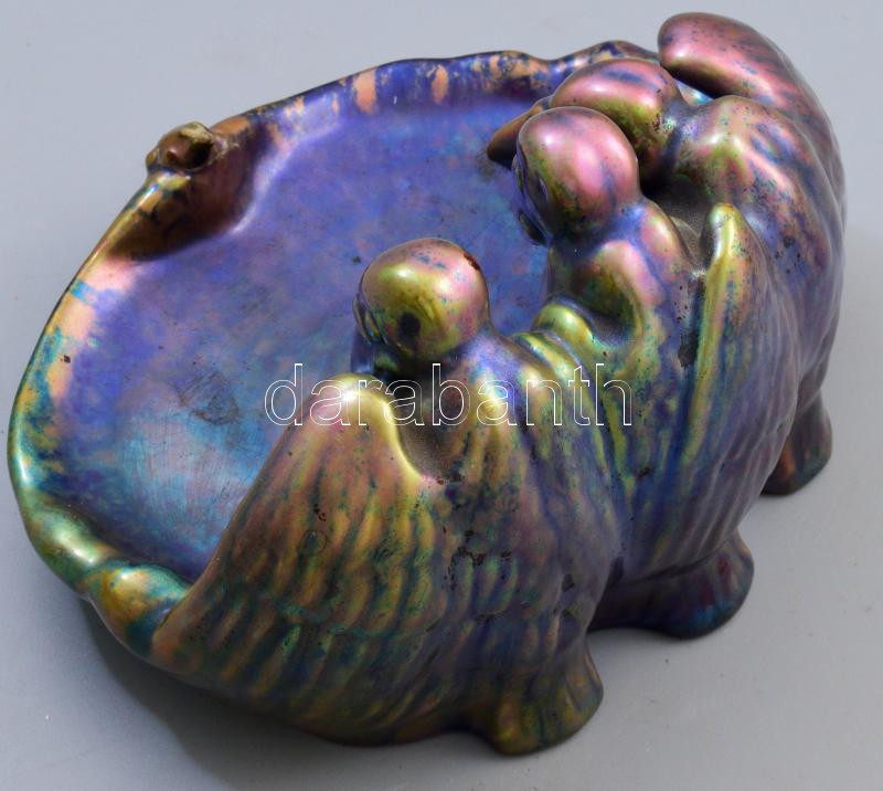 Beschreibung: cca 1920/30 Zsolnay kisplasztika - keselyű figurákkal díszített névjegykártyatartó. Savmaratott felületű, többszínű, közte domináns kékes színű eozin mázakkal fedett finomfajansz, jelzett, kis kopásokkal, a béka figurája ragasztott, 17x14x10 cm