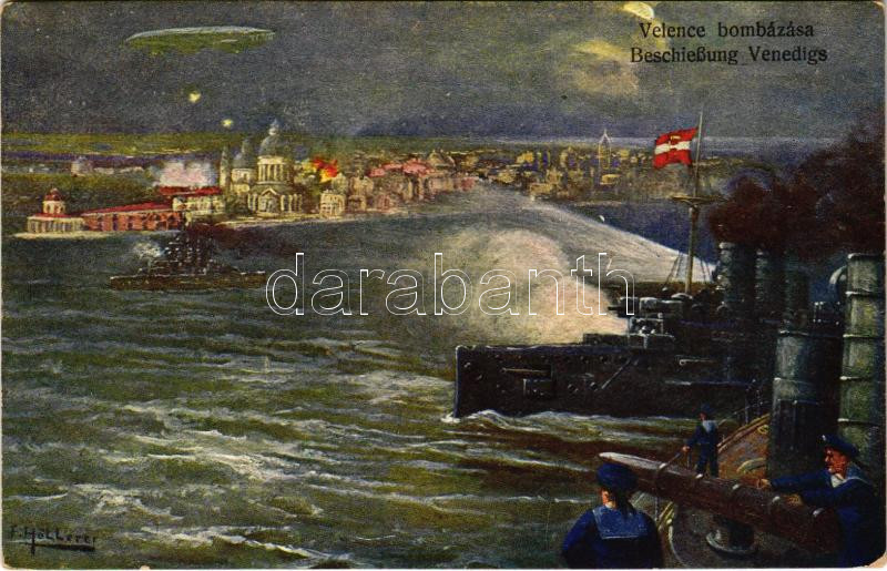 Beschreibung: 1917 Az Osztrák-Magyar Haditengerészet Velence bombázásánál / Beschießung Venedigs. K.u.K. Kriegsmarine / WWI Austro-Hungarian Navy art postcard, Bombing of Venice s: F. Höllerer