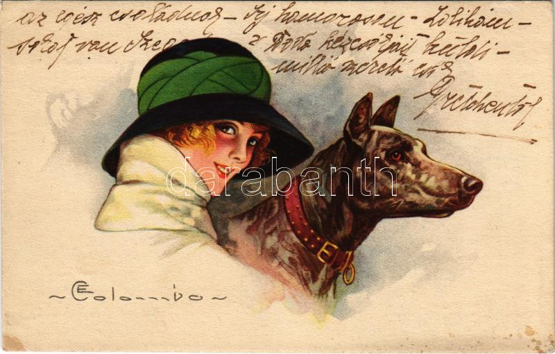 1924 Italian lady art postcard with dog. 1763-3. s: Colombo (EK) https://www.darabanth.com/de/513-Auktion-Philatelie-Postkarten-Numismatik-Kunstwerke-Bucher-Schreibwaren-Schmuck/513.0/Ansichtskarten/Kunstlerkarten~593/1924-Italian-lady-art-postcard-with-dog-1763-3-s-Colombo-EK~II3473268