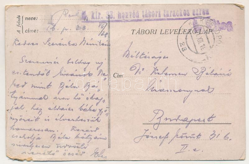 1916 38. Honvéd Hadosztály BÚÉK / WWI Austro-Hungarian K.u.K. military art postcard with New Year greeting s: Daday + "M. kir. 38. honvéd tábori tarackos ezred" "K.U.K. FELDPOSTAMT 23" (b)
