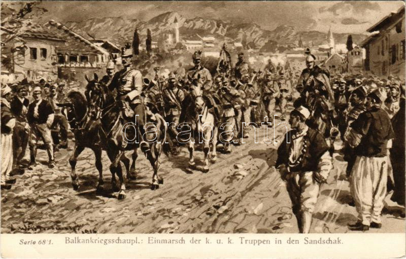Balkan Kriegsschauplatz. Einmarsch der k.u.k. Truppen in den Sandschak. Serie 68/1. Ausgabe des Kriegsfürsorgeamtes Wien / WWI German and Austro-Hungarian K.u.K. military art postcard, invasion of the Austro-Hungarian troops into the Sandzak (EK)