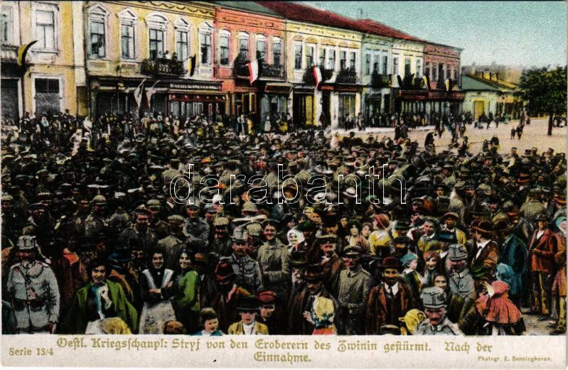 Östl. Kriegsschauplatz. Stryj von den Eroberern des Zwinin gestürmt. Serie 13/4. Ausgabe des Kriegsfürsorgeamtes Wien, Phot. E. Benninghoven / WWI German and Austro-Hungarian K.u.K. military art postcard