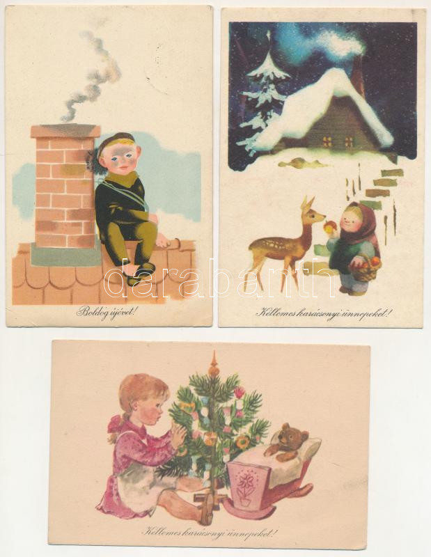 21 db MODERN motívum képeslap: karácsonyi és újévi üdvözlőlapok (Képzőművészeti Alap 50 filléres lapok) / 21 MODERN motive postcards: Christmas and New Year greeting cards