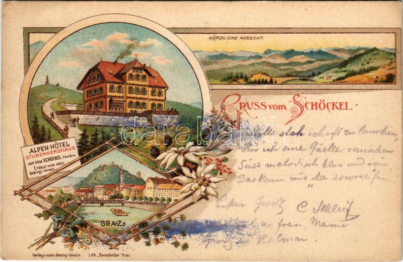 Beschreibung: 1899 Schöckl, Schöckel; Nördliche Aussicht, Alpen-Hotel Stubenberghaus, Graz. Lith. Senefelder / view, hotel. Art Nouveau, floral, litho (cut)