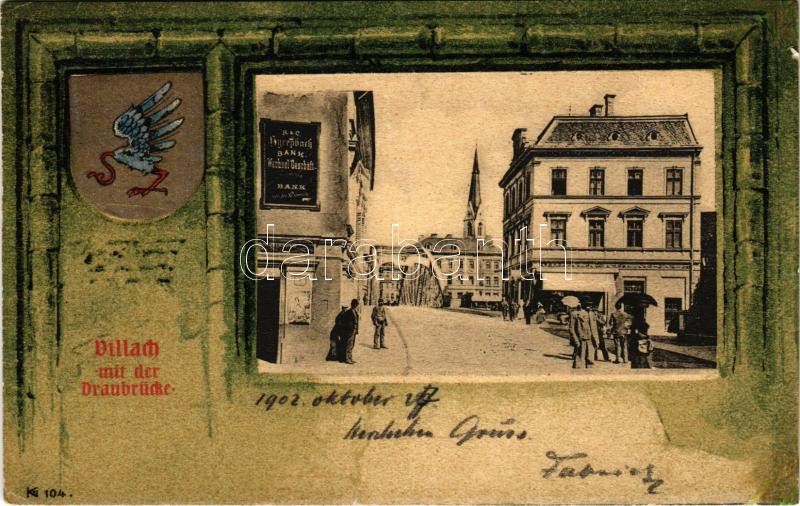 1902 Villach, mit der Draubrücke / Drava bridge, bank, shops. Art Nouv... https://www.darabanth.com/de/513-Auktion-Philatelie-Postkarten-Numismatik-Kunstwerke-Bucher-Schreibwaren-Schmuck/513.0/Ansichtskarten/Osterreich~521/1902-Villach-mit-der-Draubrucke-Drava-bridge-bank-shops-Art-Nouveau-litho-frame-with-coat-of-~II3471541