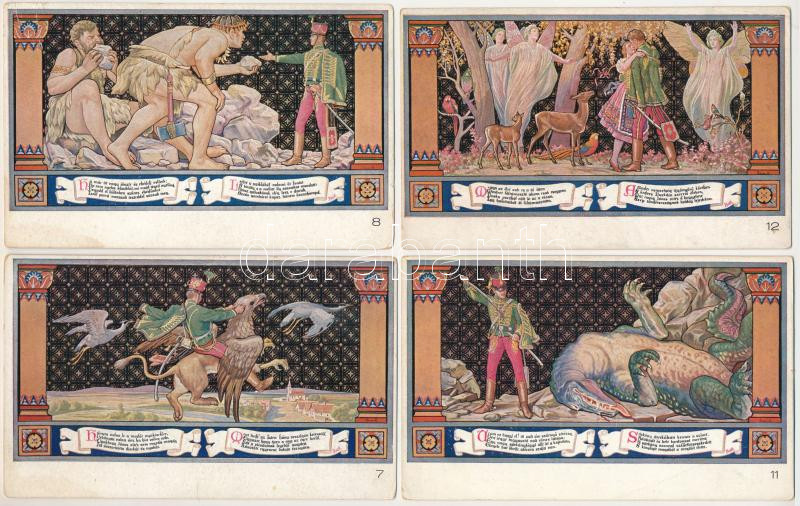 BUDAPEST - 18 db RÉGI képeslap: Egyetem utca 5. Erzsébet Királyné Szálló étterem és söröző pince, Sándor Béla falfestménye Petőfi Sándor János vitézéből, a teljes sorozatból a 10-es hiányzik + néhány duplum / 18 pre 1945 wall paintings postcards, complete series missing Nr. 10. + couple of doubles