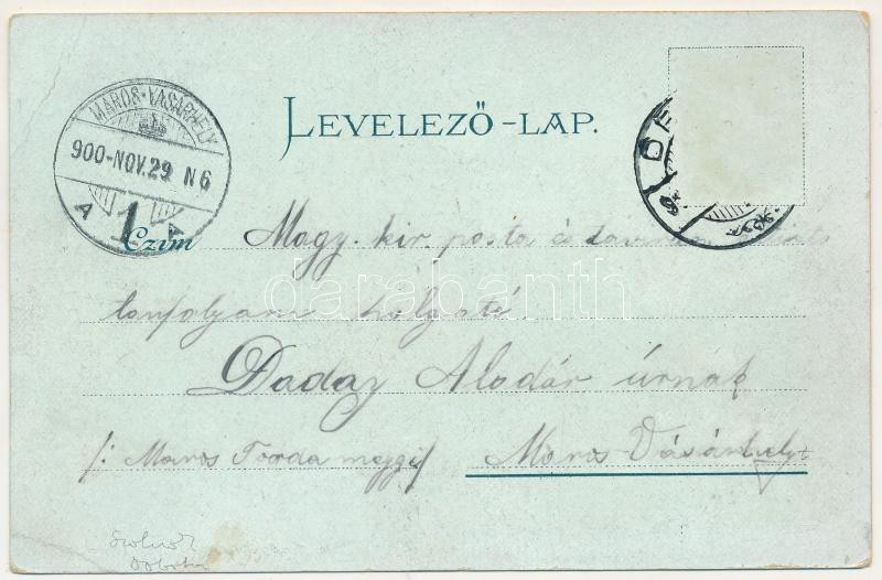 1900 Dés, Dej; Szt. Ferenc rendiek palotája, református templom, Millenniumi szobor (1919-ben ledöntötték), Voith Gergely palotája. Kapható Rehák Ágostonnál / church, palace, monument (demolished in 1919). Art Nouveau, floral, litho (EB)