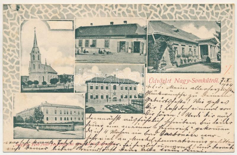 1904 Nagysomkút, Somcuta Mare; Római katolikus templom, Kővárvidéki Takarékpénztár, Teleki kastély, M. kir. Állami elemi népiskola, Megyeháza. Szigethy Jenő festő fényképészeti műterméből / Catholic church, savings bank of Tara Chioarului, castle, elementary school, county hall. Art Nouveau (EK)