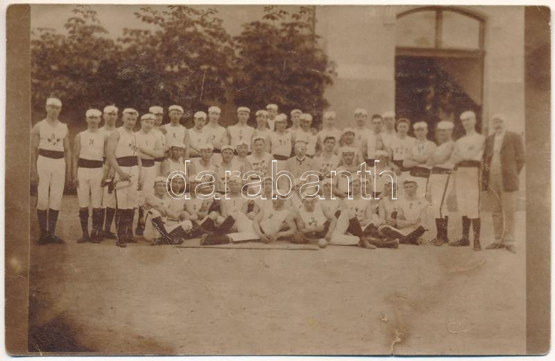 Beschreibung: 1908 Déva, Sportegyesület, sportolók csoportja / members of the sport club. photo (lyuk / hole)