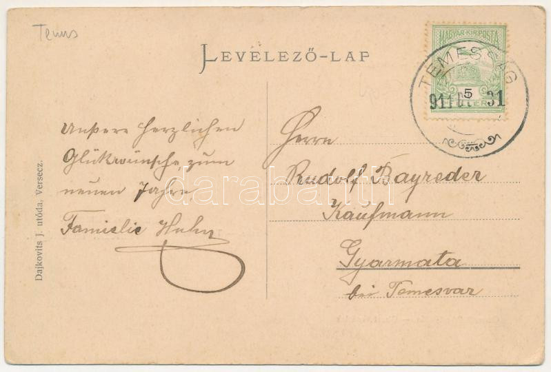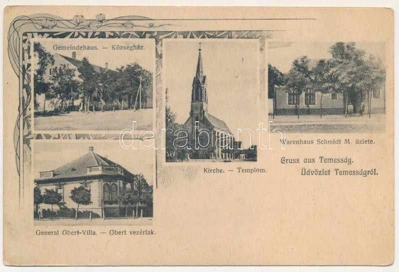 1911 Temesság, Saágh, Sag; Községháza, Templom, Obert vezér lak, Schmidt M. üzlete. Dajkovits J. utóda kiadása / town hall, church, villa, shop. Art Nouveau, floral (EK)