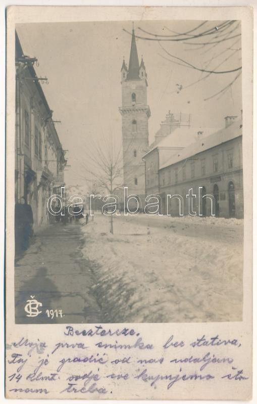Beschreibung: 1917 Beszterce, Bistritz, Bistrita; Evangélikus templom télen, üzletek / Lutheran church in winter, shops. photo + "K.u.K. Zensurstelle Besztercze" (gyűrődés / crease)