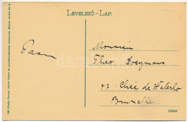 Kolozsvár, Cluj; Mátyás király téri részlet, Wolff J. gyógyszertára, Hubay Károly, Bányai Sámuel és Fia, Csiky Mihály, Jeszenszky Ferenc, Dániel Antal, Stein Z. üzlete, Kolozsvári Takarékpénztár és Hitelbank Részvénytársaság. Keszey Albert kiadása / square, pharmacy, shops, savings bank (fl)