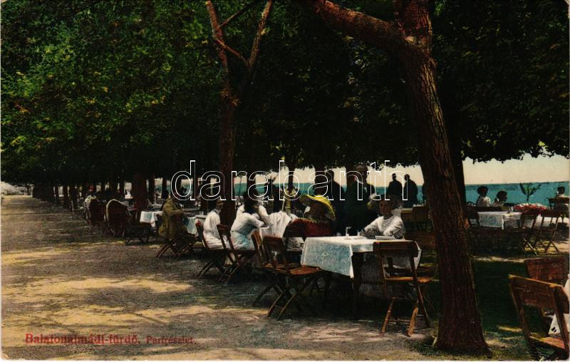 Beschreibung: Balatonalmádi, fürdő, partrészlet, étterem kerthelyisége vendégekkel (EK)