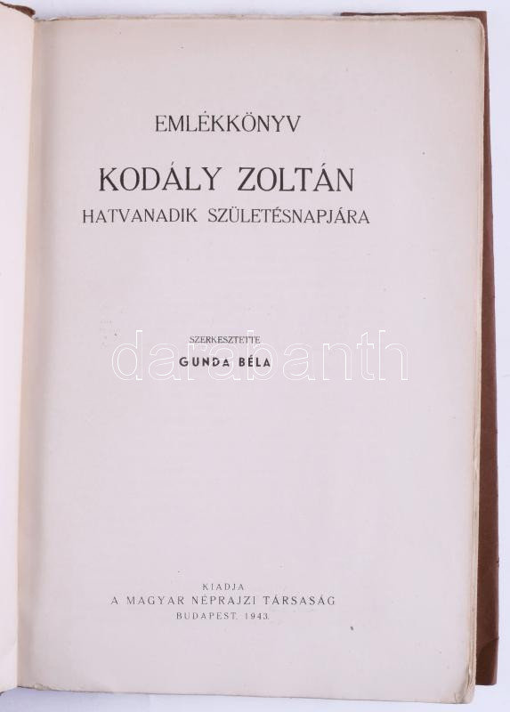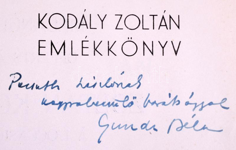 Emlékkönyv Kodály Zoltán hatvanadik születésnapjára. Szerk.: Gunda Béla. Passuth László irónak dedikált a szerző által! Bp., 1943, Magyar Néprajzi Társaság, 1 (hártyapapírral védett címkép) t.+ 2 sztl. lev.+ III+(1)+369+(3) p. Újrakötött papírkötés Megjelent 2000 példányban.