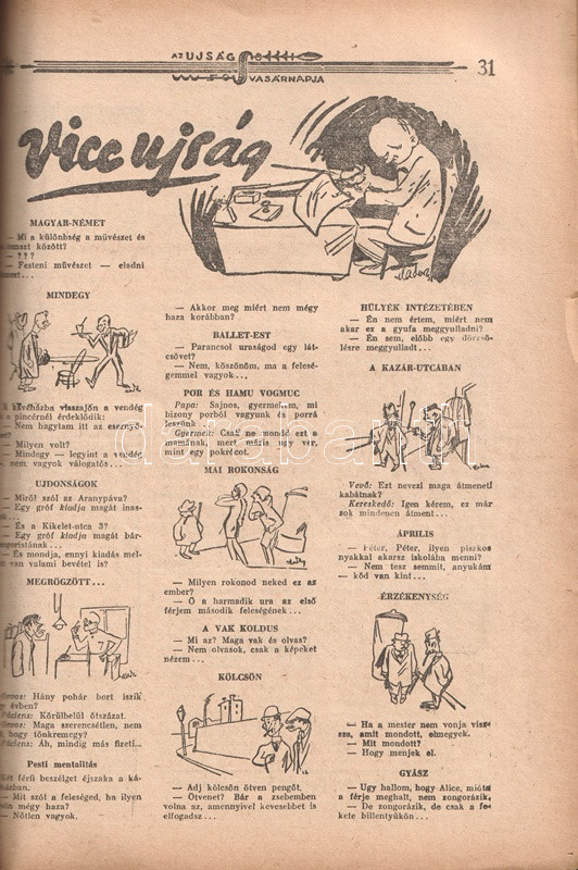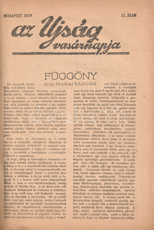"Az Ujság" című nemzeti szabadelvű napilap 1903-ban indult útjára, jeles írógárda toborzásával. Első évtizedében Mikszáth Kálmán, Herczeg Ferenc, Kozma Andor, Kóbor Tamás és a pályakezdő Móricz Zsigmond irodalmi és publicisztikai munkásságának is helyt adott. Az egyik legfontosabb pesti lappá váló újság túlélte a Monarchia összeomlását, a Tanácsköztársaságot, és folytatta működését a Horthy-érában is. Gazdagon illusztrált irodalmi és ismeretterjesztő melléklapja, "Az Ujság vasárnapja" 1925-ben indult. Ötödik évfolyamába lépő családi magazinunk az irodalmi anyagon: a novellákon, a folytatásos tárcaregényeken, verseken kívül útírásokat, képzőművészeti, történelmi, földrajzi, néprajzi és technikatörténeti ismeretterjesztő anyagokat közöl; divat- és lakberendezési rovata a nőknek, meserovata a gyermekeknek, kép- és keresztrejtvényei, színházi és filmes hírei minden korosztálynak szólnak. Lapszámaink borítóin kortárs magyar festők művei, többek közt Glatz Oszkár, Fényes Adolf, Vaszary János borítófestményei. Lapszámaink irodalmi anyagában Márai Sándor, Kodolányi János, Tersánszky J. Jenő prózái, Illyés Gyula versei, Róheim Géza úti beszámolói, Dánielné Lengyel Laura irodalmi portréi, Fried Margit, Elek Oszkár, Cholnoky Béla ismeretterjesztő írásai, Háy Gyula művészettörténeti írásai. A lapszámok végén gazdag képanyaggal kísért, bő válogatás a világ kurrens érdekességeiből, hollywoodi és színházi híreiből.