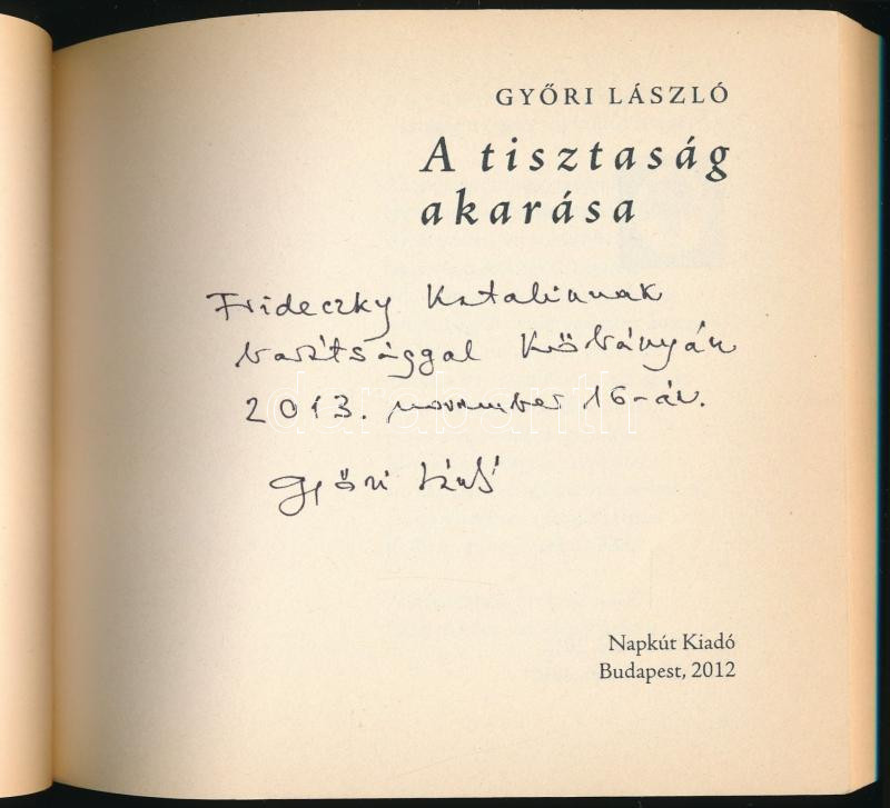 Győri László: A tisztaság akarása. A szerző, Győr László által DEDIKÁL... https://www.darabanth.com/de/513-Auktion-Philatelie-Postkarten-Numismatik-Kunstwerke-Bucher-Schreibwaren-Schmuck/513.0/Bucher/Bucher-Andere-kuriositaten~175/Gyori-Laszlo-A-tisztasag-akarasa-A-szerzo-Gyor-Laszlo-altal-DEDIKALT-peldany-Bp-2~II3471688