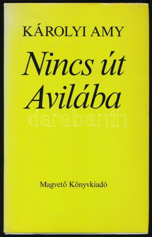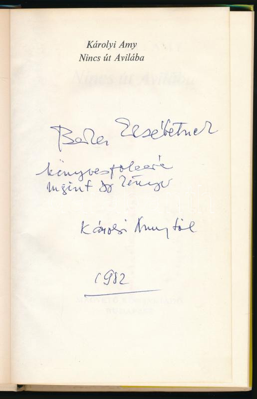 Károlyi Amy: Nincs út Avilába. A szerző, Károlyi Amy (1909-2003) költő, műfordító, Weöres Sándor (1913-1989) felesége által DEDIKÁLT példány! Bp., 1982, Magvető, 146+2 p. 1. kiadás. Kiadói egészvászon-kötés, kiadói papír védőborítóban.