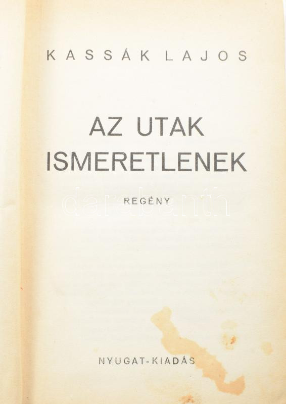Kassák Lajos: Az utak ismeretlenek. A szerző, Kassák Lajos (1887-1967) író, költő, műfordító grafikus, képzőművész, 'a magyar avantgárd atyja' által ALÁÍRT példány! [Bp.,1934], Nyugat, (Viktória-ny.), 191 p. Első kiadás. Kiadói aranyozott egészvászon-kötés, kopott borítóval, foltos címlappal és elülső előzéklappal.