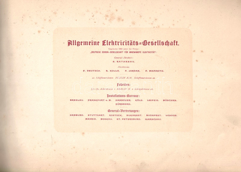 [Képes árukatalógus] Az 1883-ban alapított berlini Allgemeine Elektricitäts-Gesellschaft épületvillamossági vállalkozás képes árukatalógusa (1894).