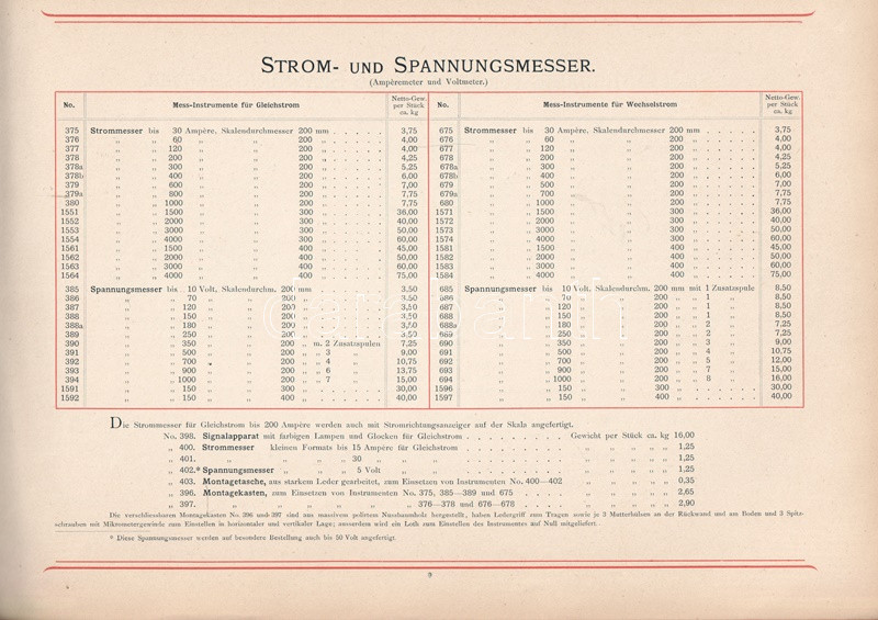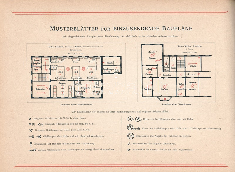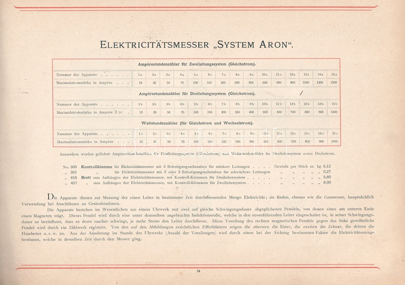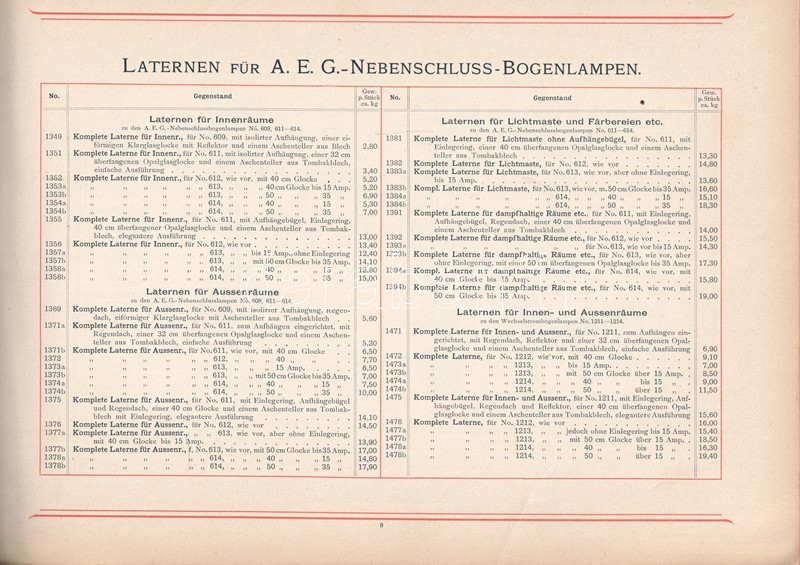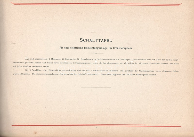 A berlini AEG épületvillamossági vállalkozás képes árukatalógusa lakóépületek, középületek és ipari épületek elektromos rendszereinek részleteit vázolja, oldalszámozáson belül egész oldalas ábrákkal, alaprajzokkal. A bevezetőből és nyolc tematikus fejezetből álló katalógus végén tartalomjegyzék. Az előzékeken Németország vasútjainak térképe, illetve hajózási világtérkép.