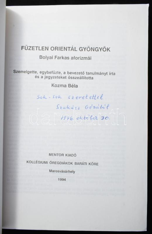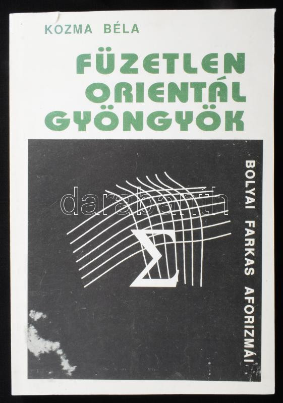 Kozma Béla: Füzetlen orientál gyöngyök. Bolyai Farkas aforizmái. Maros... https://www.darabanth.com/de/513-Auktion-Philatelie-Postkarten-Numismatik-Kunstwerke-Bucher-Schreibwaren-Schmuck/513.0/Bucher/Bucher-Andere-kuriositaten~175/Kozma-Bela-Fuzetlen-oriental-gyongyok-Bolyai-Farkas-aforizmai-Marosvasarhely-1994-Mento~II3471620
