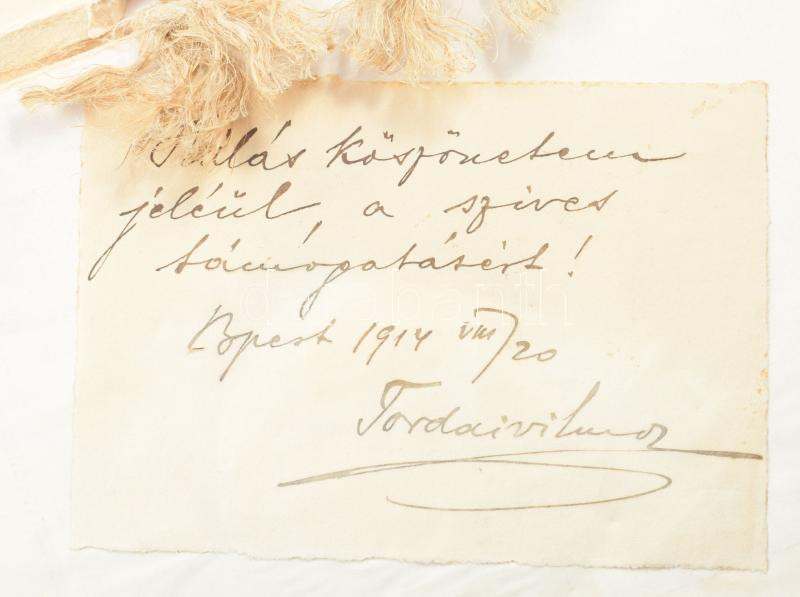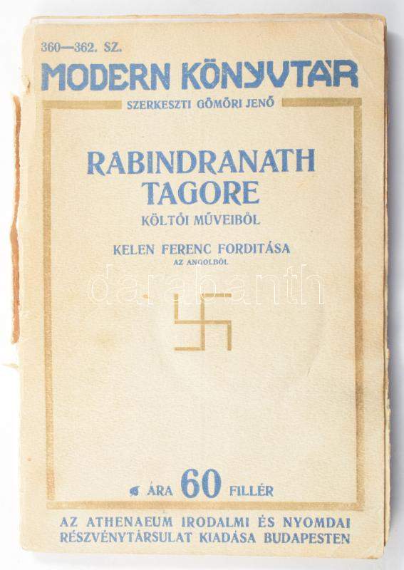 Rabindranath Tagore költői műveiből. Ford.: Kelen Ferenc. Modern Könyvtár 360-362. sz. Bp.,[1914.],Athenaeum, 1 [Tagore arcképe] t.+70+2 p. A címkép hátoldalán ajándékozási címkével: "Hálás köszönetem jeléül, a szíves támogatásért! B[uda]pest 1914 VIII/20. Tordai Vilmos." Kiadói papírkötés, sérült borítóval, a könyvtest elvált a borítótól, amatőr módon javított könyvtesttel.