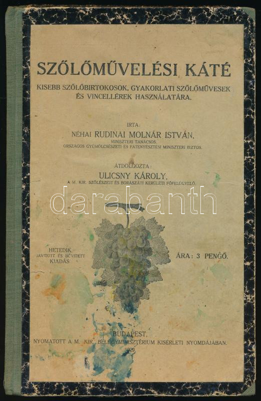 Molnár István, rudinai: Szőlőművelési káté. Kisebb szőlőbirtokosok, gyakorlati szőlőművesek és vincellérek használatára. Átdolgozta: Ulicsny Károly. Ulicsny Károly (1870-?) szőlészeti-borászati főfelügyelő által dedikált példány. Bp., 1929, M. Kir. Belügyminisztérium Kísérleti Ny., 105+(7) p. Átkötött félvászon-kötésben, néhány foltos lappal.