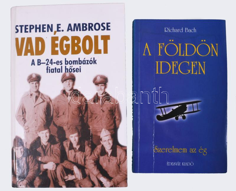 2 db könyv repülők témában: Stephen E. Ambrose: Vad égbolt, a B-24-es bombázók fiatal hősei. nh., 2001, Gabo Kiadó. Kiadói k artonált papírkötés; Richard Bach: A földön Idegen. Bp., 1998, Édesvíz Kiadó. Kiadói papírkötés