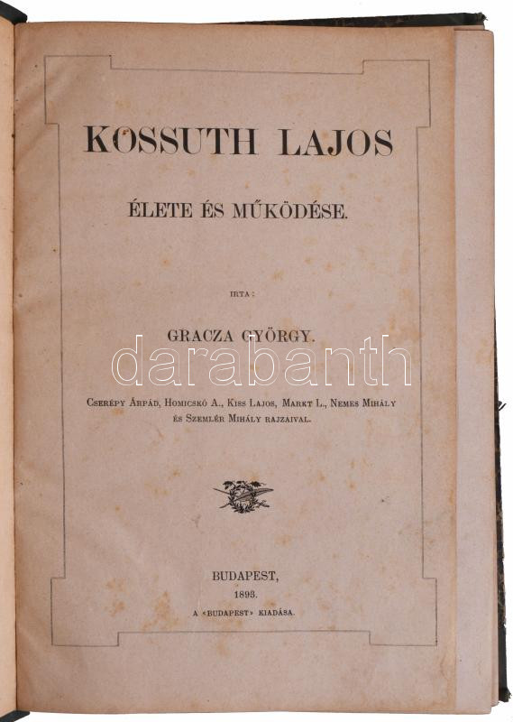 Gracza György: Kossuth Lajos élete és működése. Cserépy Árpád, Homicskó A[thanáz], Kiss Lajos, Markt L., Nemes Mihály és Szemlér Mihály rajzaival. Bp., 1893., "Budapest", (Wodianer F. és Fiai-ny.), 4+230+2 p. Szövegközti és egészoldalas ábrákkal. Átkötött félvászon-kötés, kopott borítóval, sérült gerinccel, néhány kijáró lappal.