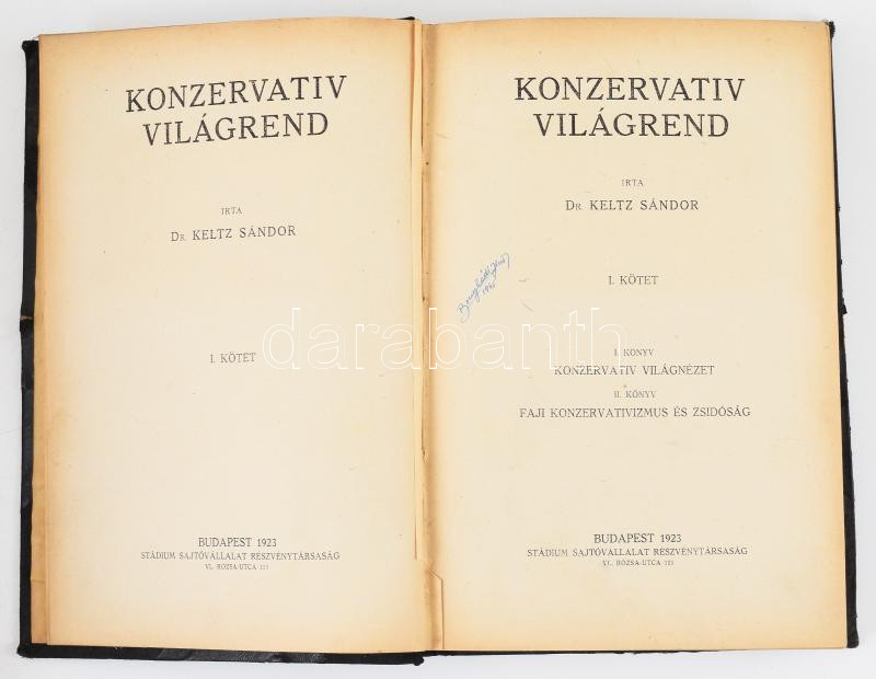 Keltz Sándor: Konzervatív világrend. I-II. kötet. Egybe kötve I. kötet: I. könyv: Konzervatív világnézet. II. könyv: Faji konzervativizmus és zsidóság. II. kötet: III. könyv: Konzervatív politika. IV. könyv: Konzervatív közgazdaság. Bp., 1923-1924., Stádium, 288 + [2] p.; 193 + [3] p. Egyetlen kiadás. Példányunk a könyv 1926-ban megjelent harmadik kötetét nem tartalmazza. A mű szerepel az Ideiglenes Nemzeti Kormány által 1945-ben kiadott, tiltott könyvek listáján. Korabeli, enyhén sérült félvászon kötésben. Nagyon ritka.