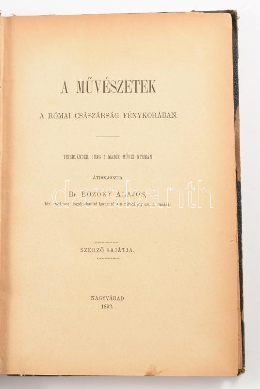 ozóky Alajos: A művészetek a római császárság fénykorában. Friedlär, Jung s mások művei nyomán átdolgozta: - - . Nagyvárad, 1892, szerzői kiadás (ifj. Berger S.-ny.), 2 sztl. lev.+ 188 p. Egyetlen kiadás. Korabeli félvászon-kötésben,