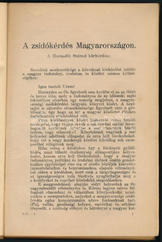 A zsidókérdés Magyarországon. A Huszadik Század körkérdése. [Bp., 1917, Társadalomtudományi Társaság], 164 p. Átkötött egészvászon-kötésben, kissé foltos borítóval, sérült gerinccel, hiányzó címlappal.