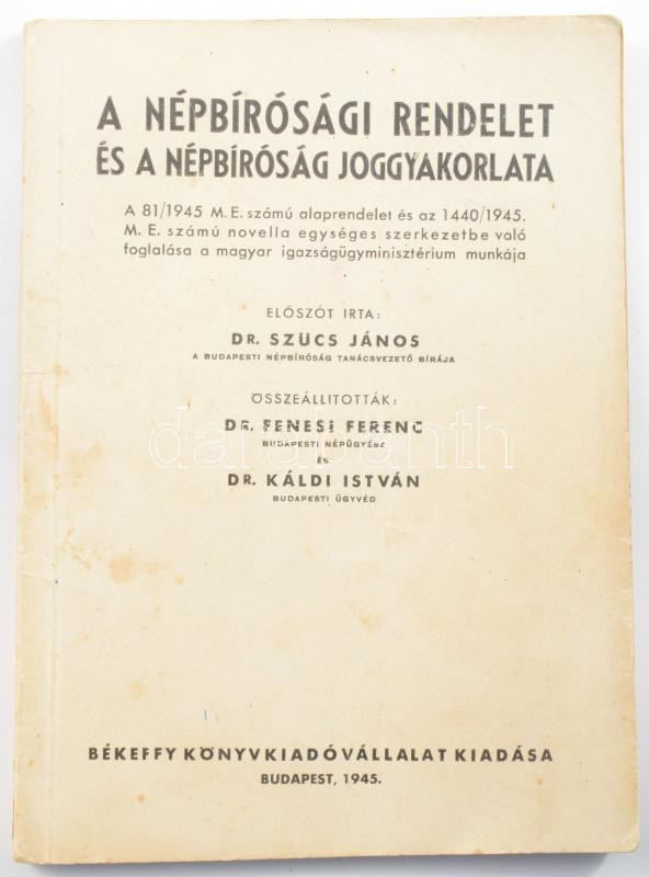 Dr. Fenesi Ferenc - Dr. Káldi István (szerk.): A népbírósági rendelet és a népbíróság joggyakorlata. Bp., 1945, Békeffy Könyvkiadóvállalat kiadása. Kiadói, belül ragasztott papírkötés.
