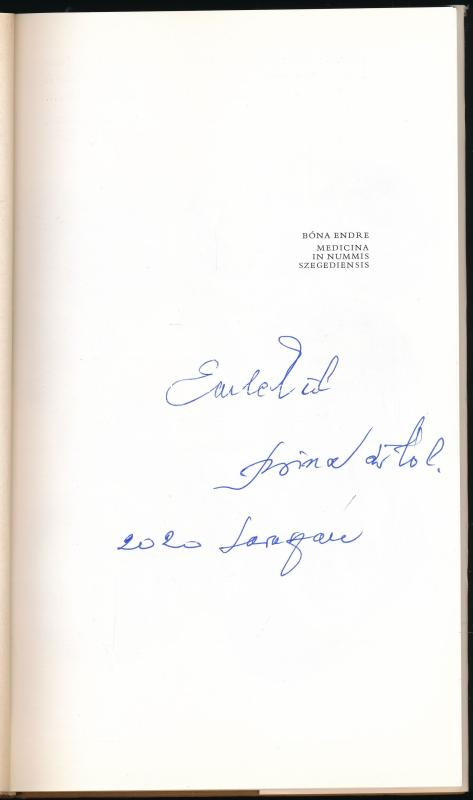 Bóna Endre: Medicina in nummis Szegediensis. Szegedi vonatkozású orvos-gyógyszerész történeti emlékek. A szerző, Dr. Bóna Endre által dedikált példány. Szeged, 1986, Somogyi Könyvtár. Kiadói egészvászon-kötés, kiadói papír védőborítóban. Megjelent 3000 példányban.