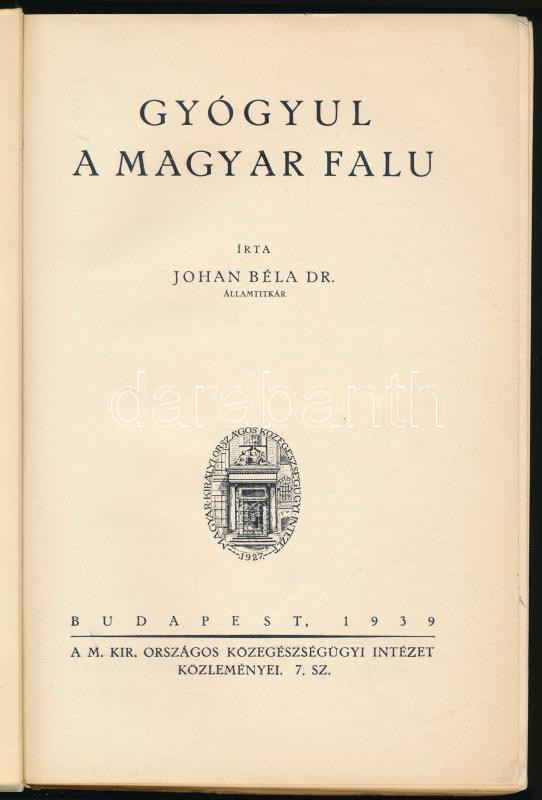 Johan Béla: Gyógyul a magyar falu. A M. Kir. Országos Közegészségügyi Intézet közleményei 7. sz. p., 1939, M. Kir. Országos Közegészségügyi Intézet, 296 p. Egyetlen kiadás. Kiadói papírkötés, kissé sérült, foltos borítóval és gerinccel, belül a lapok jó állapotban, néhány ceruzás bejegyzéssel.