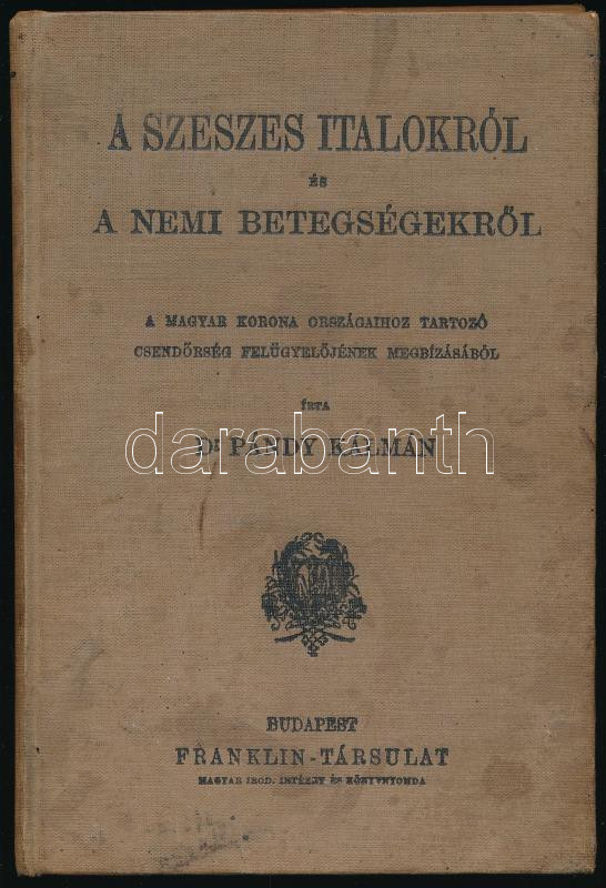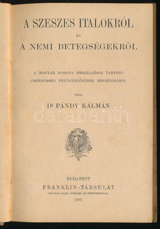 Pándy Kálmán: A szeszes italokról és a nemi betegségekről. A magyar korona országaihoz tartozó csendőrség felügyelőjének megbízásából írta - - . Bp., 1907, Franklin-Társulat, 112 p. Kiadói egészvászon-kötés, foltos borítóval, helyenként kissé foltos lapokkal, tulajdonosi bejegyzésekkel.