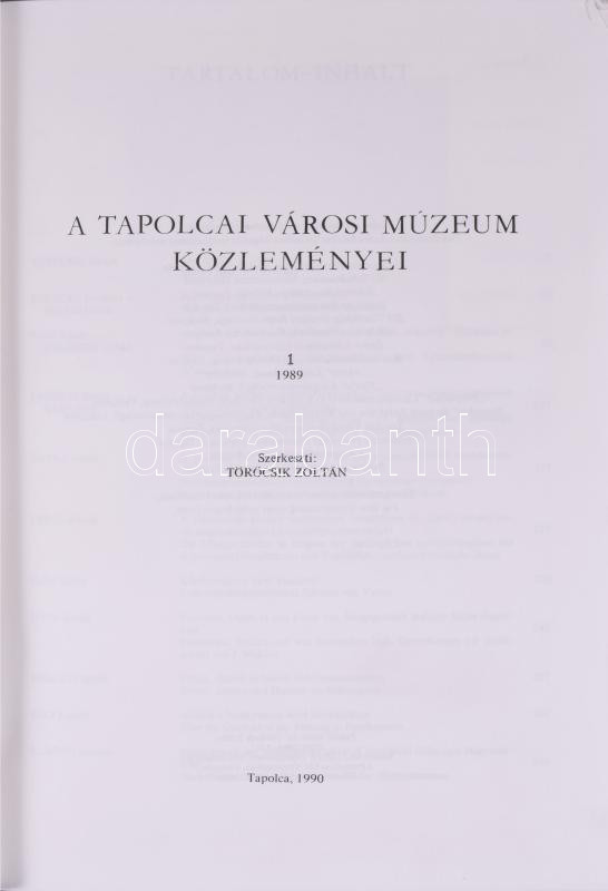 A Tapolcai Városi Múzeum közleményei 1. 1989. Szerk.: Törőcsik Zoltán. Tapolca, 1990, Városi Múzeum, 540+(8) p. Fekete-fehér képekkel illusztrálva. Kiadói papírkötés, kissé kopott borítóval. Megjelent 500 példányban.