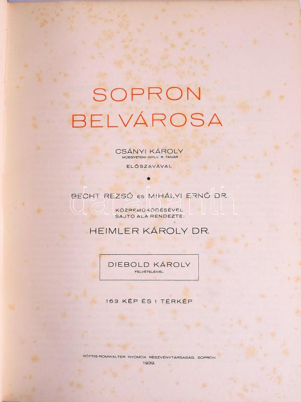 Dr. Heimler Károly (szerk.): Sopron műemlékei I. Belváros. Sopron, 1939, Soproni Városépítő Egyesület. Félbőr kötés, sérült papír védőborítóval, sérült gerinc, viseltes állapotban.