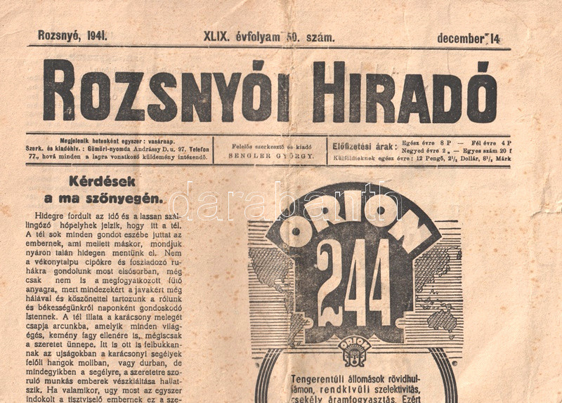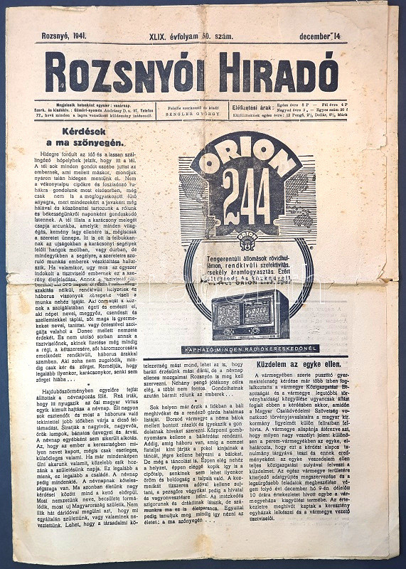 [Folyóirat] Rozsnyói Híradó. Felelős szerkesztő: Sengler György. Megjelenik vasárnaponként. XLIX. évfolyam, 50. szám. (1941. december 14.)