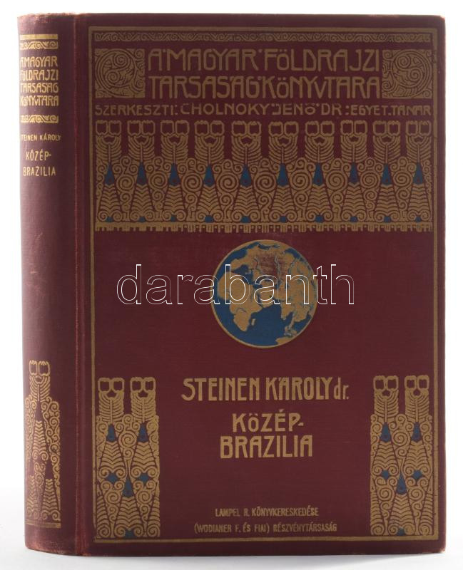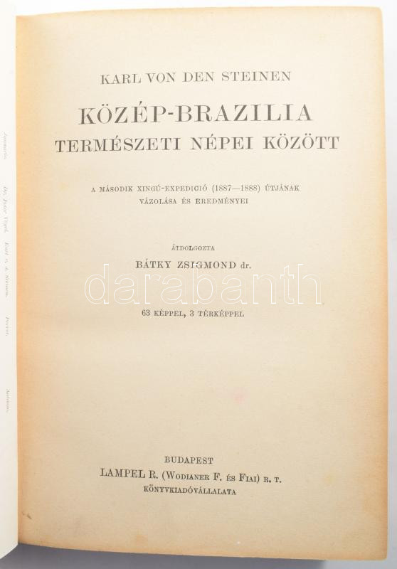 [Steinen, Karl von den (1855-1929)]: dr. Steinen Károly: Közép-BrazÃlia természeti népei között. A második Xingú-expedició (1887-1888) útjának vázolása és eredményei. 63 képpel, 3 térképpel. FordÃtotta: dr. Bátky Zsigmond. Magyar Földrajzi Társaság Könyvtára. Bp.,é.n., Lampel R. (Wodianer F. és Fiai) Rt., Franklin, 240 p. +8 (fekete-fehér fotók) t. +3 (térkép) t. Egészoldalas és szövegközti illusztrációkkal, fekete-fehér fotókkal, térképekkel illusztrált. Kiadói dúsan aranyozott egészvászon sorozatkötésben, minimális kopással