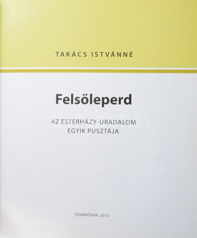 Takács Istvánné: Felsőleperd. Az Eszterházy-uradalom egyik pusztája. A szerző, Takács Istvánné, a Dombóvári Vásorsszépítő és Városvédő Közhasznú Egyesület kegyeleti munkacsoportjának vezetője által DEDIKÁLT példány. Dombóvár, 2013, Dalmand Község Önkormányzata, 384 p. Kiadói kartonált papírkötés.