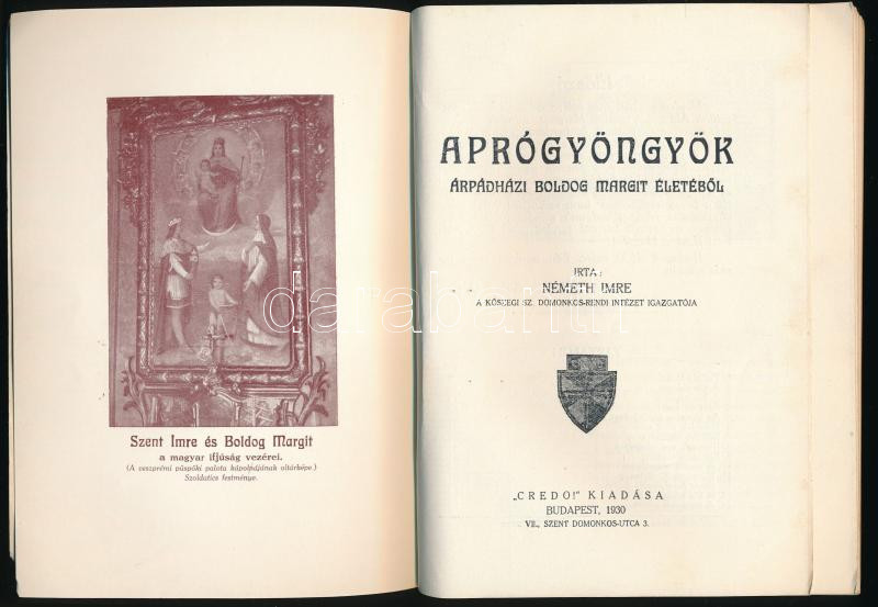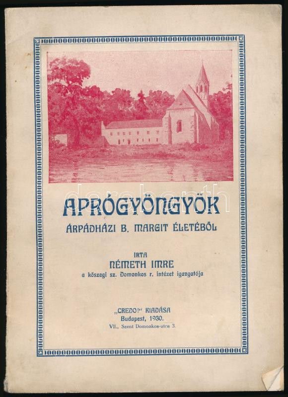 Németh Imre: Aprógyöngyök Árpádházi Boldog Margit életéből. Bp., 1930, Credo, 96 p.+ 6 t. Egyetlen kiadás. Kiadói papírkötés, kissé koszos borítóval.