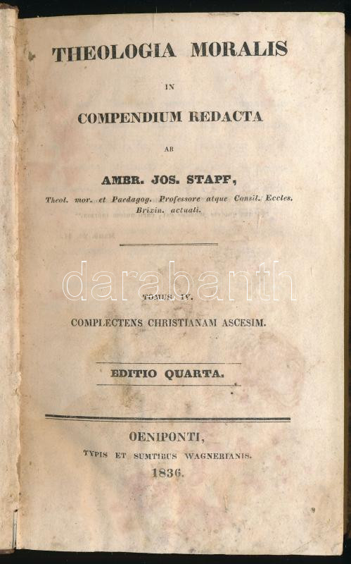 Beschreibung: Stapf, [Joseph Ambrosius (1785-1844)]: Theologia moralis in compendium redacta. Tomus IV. Oeniponti [Innsbruck], 1836, Typis et Sumtibus Wagnerianis, 6 sztl. lev.+ 348 p. Latin nyelven. Korabeli félbőr-kötésben, viselte, sérült borítóval, helyenként ázásnyomokkal.