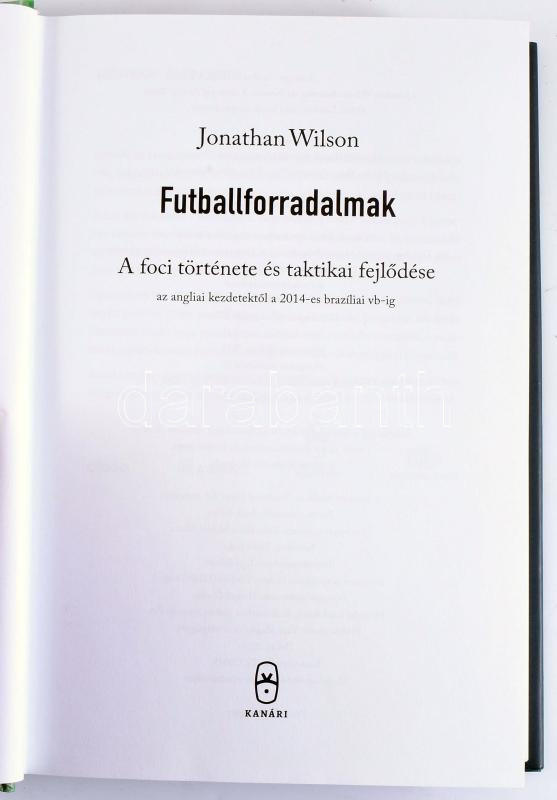 Jonathan Wilson: Futball forradalmak. A foci története és taktikai fejlÅ‘dése az angliai kezdetektÅ‘l a 2014-es brazÃliai vb-ig. Kanári. Bp., 2014, Akadémiai Kiadó. Kiadói kartonált papÃrkötés, kiadói papÃr védÅ‘borÃtóban.