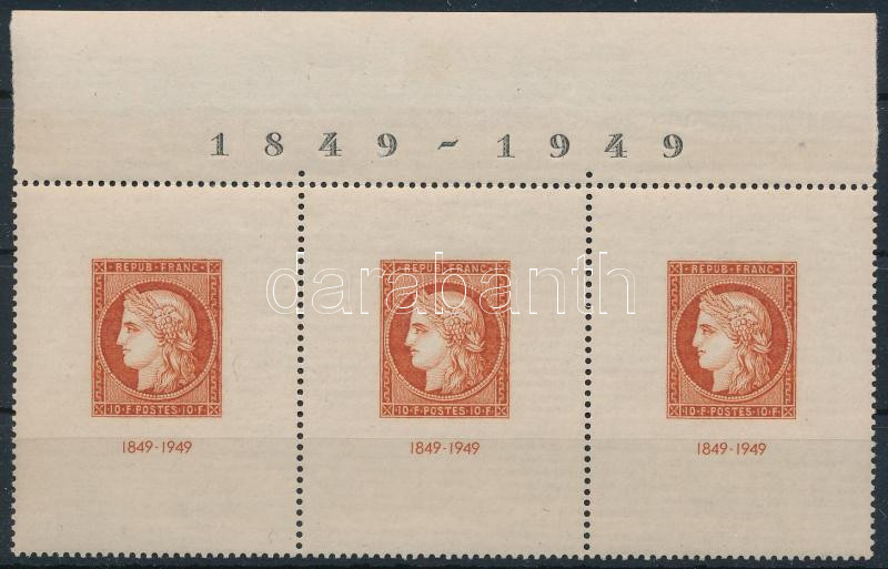 Beschreibung: Franciaország 1949 Bélyeg kiállítás blokk a teljes ívből származó ívszéli hármascsíkban, ívszéli felirattal / 3 x Mi block 4. RR! (Mi EUR 150,- +++)