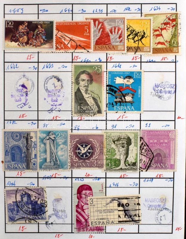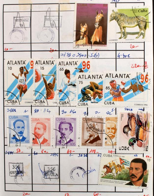 Beschreibung: 70 db futott cserefüzet oldalanként 20 bélyeghellyel, benne vegyes külföldi bélyegek tengerentúlival