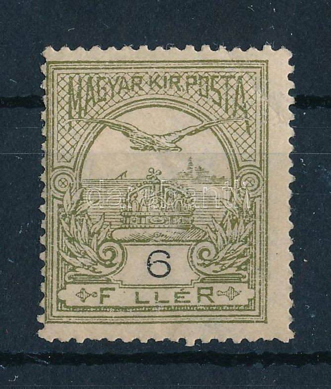 Beschreibung: 1906 Turul 6f, a FILLÉR "I" nélkül (25.000) (enyhe törés a jobb felső sarokban / light corner fold right above)