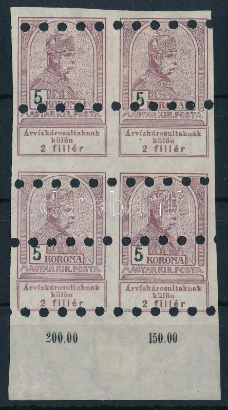 1913 Árvíz 5K fogazatlan ívszéli négyestömb megsemmisítő lyukasztással https://www.darabanth.com/de/513-Auktion-Philatelie-Postkarten-Numismatik-Kunstwerke-Bucher-Schreibwaren-Schmuck/513.0/Erlesene-Lose-und-Sammlungen-Ungarn/Einzelne-Gebotslose-Ungarn~1/1913-Arviz-5K-fogazatlan-ivszeli-negyestomb-megsemmisito-lyukasztassal~II3465920