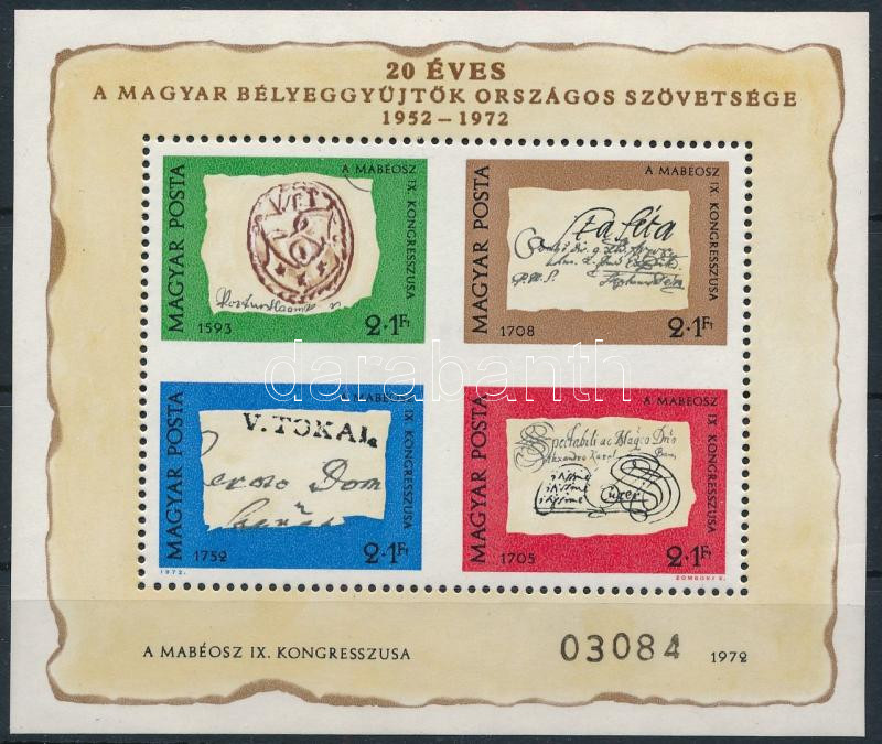 1972 Bélyegnap blokk ajándék változat (régi katalógus ára 30.000 Ft, a... https://www.darabanth.com/de/513-Auktion-Philatelie-Postkarten-Numismatik-Kunstwerke-Bucher-Schreibwaren-Schmuck/513.0/Erlesene-Lose-und-Sammlungen-Ungarn/Einzelne-Gebotslose-Ungarn~1/1972-Belyegnap-blokk-ajandek-valtozat-regi-katalogus-ara-30000-Ft-az-uj-katalogusban-nem~II3469441